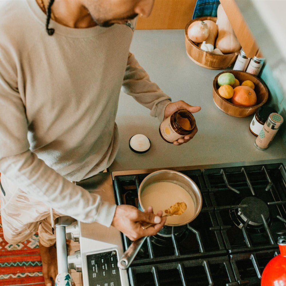 This golden tonic—traditionally known as Haldi Doodh —is a revered Ayurvedic elixir balancing to all doshas. Grounding herbs & spices such as turmeric, cinnamon, ginger & cardamom support healthy digestion, circulation & immunity. Meanwhile, adaptogenic ashwagandha & shatavari rejuvenate the body, nourish the nervous system & help ease the effects of daily stress.