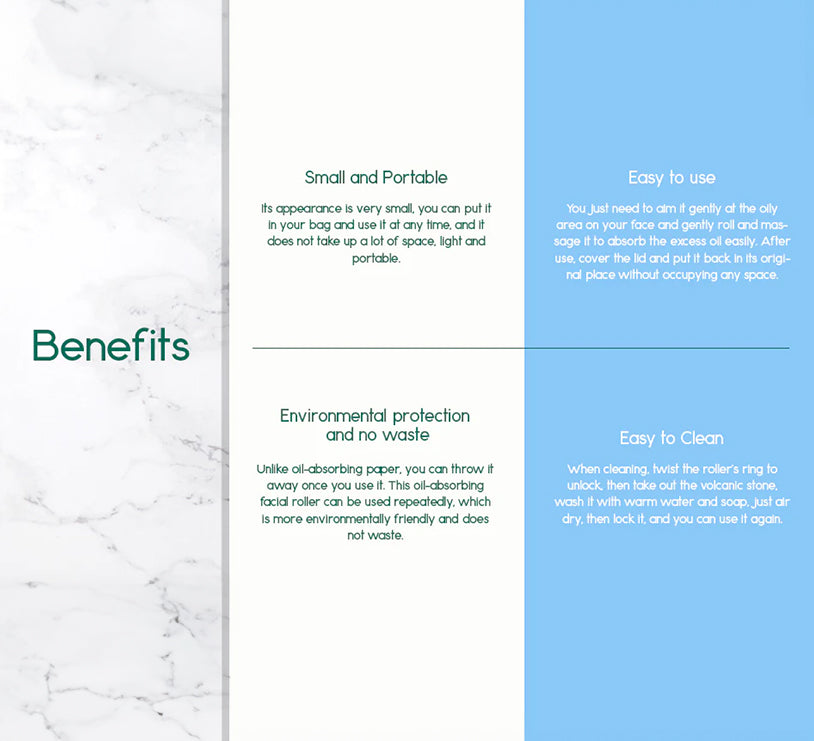 Reusable : This oil-absorbing facial roller is made of real volcanic stone, which can instantly remove excess facial oil, restore clean matte skin, keep our makeup clean at all times, and can be reused.